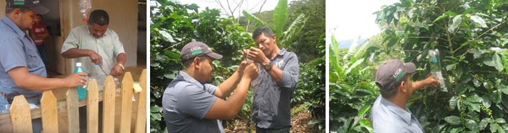 El ingeniero Eric Quezada, del proyecto de café Kolping, capacita a productores de café de la familia Kolping "Amigos del Cedral" sobre control cultural de la plaga broca del café, mediante la colocación de trampas que reducirán el porcentaje de café con daño físico, aumentando el rendimiento por manzana de café. |