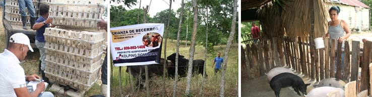 Algunos de los nuevos Emprendimientos Aprobados iniciados en diferentes comunidades, apoyados por Kolping Dominicana: proyecto crianza y mejora de becerros en Los Mota, La Vega, proyecto de Ramón Mota de la familia Kolping "San Francisco de Asis", y crianza de cerdos en la comunidad Los Mota, La Vega. |