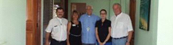 Se realizó un encuentro con Monseñor Fray Gabriel Enrique, el nuevo obispo de la Parroquia San Isidro Labrador, en la foto aparecen de izquierda a derecha el Praeses Rafael Vega, la Sra. Katia Fernández coordinadora de Kolping Costa Rica, Sr. Werner Sondermann delegado de Kolping por la Diócesis de Paderborn, La Srta. Simone Lehmann encargada regional de Kolping. |