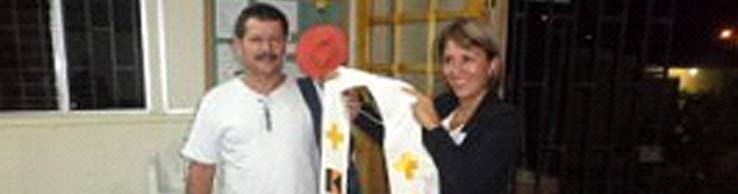 La coordinadora de Kolping Costa Rica hace entrega al Praeses Rafael Vega de una estola regalo que le envió Monseñor Ottmar Dillenburg como regalo para sus celebraciones. |