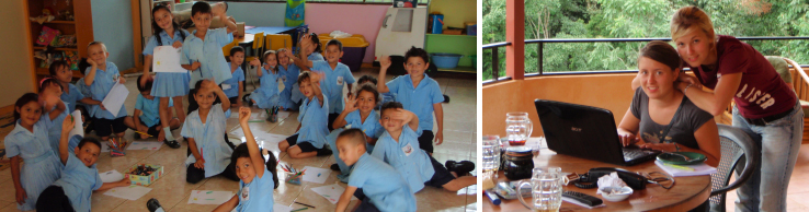 El trabajo de estas dos voluntarias alemanas: Julia (sentada) y Felicitas; rinde sus frutos. Durante más de seis meses, estuvieron integradas en diferentes proyectos tales como el Circo Fantazztico, La Casita y el Proyecto Carpa. Sobresalió su trabajo con los niños y niñas de la Escuela San Andrés, ubicada 100 metros al sur de la Casa Kolping. Ahí colaboraron con la educación de estudiantes de materno y preescolar en temas como inglés, arte, juego y expresión corporal. También ayudaron a las profesoras con la enseñanza en educación especial e inglés para niños de grados superiores. El señor director, las maestras y los niñ@s de la Escuela están muy satisfech@s con los aportes de las dos voluntarias y aunque algunas veces el idioma puso algunos obstáculos, éstos se superaron rápidamente. |