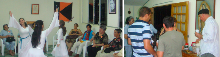 Es una inquietud de la Familia Kolping convertirse en un ente atractivo para la juventud. Actualmente l@s jóvenes se ven obligados a desenvolverse en ambientes muy difíciles y con muchas limitaciones, tanto económicas, como espirituales y emocionales. Por ese motivo se trabaja en un diagnóstico de necesidades dirigido a la niñez y juventud en la comunidad aledaña a la Casa Kolping. En la fotografía aparece un grupo de jóvenes dando una presentación de danza hebrea y compartiendo su alegría con miembros de la Familia Kolping. Durante las actividades se han incluido los refrigerios aportados por miembr@s Kolping, como una forma de socializar y hacer más ameno el tiempo compartido. |